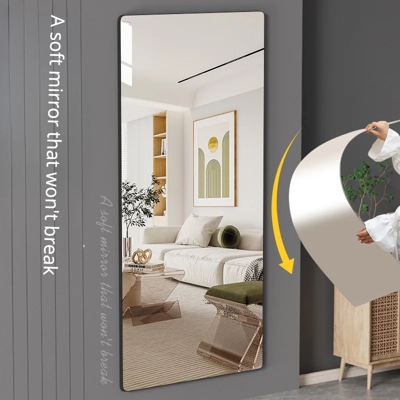 The main unit is lightweight, making it easy to install by yourself. It can be used in a variety of places, such as entryways, closet doors, washrooms, bathrooms, and dressing rooms. This unbreakable full-length mirror can be applied to any desired locationEasy to install: You can stick it to the corners of the mirror back with the adhesive sticker, and it can be installed on any flat wall or door. Only 3 minutes to install, safer and more convenient than regular glass mirrorsRelieves Your Worries and Anxiety You want a full body mirror, but you can’t put it in your house because of your narrow home? You cannot want to install a wall mirror in your rental home, and you want to stick it to your closet door, but if you are concerned about dropping, Please consider this acrylic soft mirrorSafe & Shatterproof: In case of an earthquake or other disaster, the mirror will fall from the wall to prevent secondary disasters. The product has an anti-knock thin membrane that events it from splashing out even if it gets strong impactsInstallation Precautions To prevent the reflection of the mirror from distortion, please be sure to attach the sticker to a corner and place it on a flat surface with no uneven surfaces